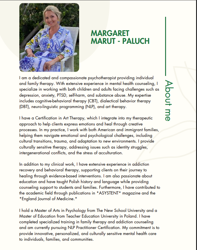 Her academic path reflects this dedication. Beginning at the City University of New York, she studied music therapy before pursuing Music and Psychology at Hunter College, Clinical Art Therapy at C.W. Post/Long Island University and finally earning her doctorate in Clinical Psychology at Saybrook University. Along the way, she worked directly with children, adults, and seniors across Queens and Long Island, contributing to institutions such as the North Shore Rehabilitation Center, Parker Geriatric Institute, the Queens Museum of Art, and Holliswood Psychiatric Hospital.